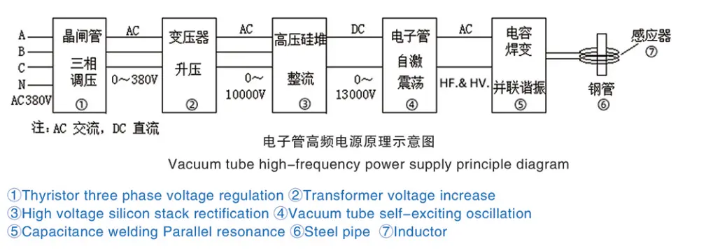 AC industri normal (tiga fase empat kabel 380V/50HZ di Tiongkok) diubah menjadi AC yang dapat disesuaikan mulai dari 0 hingga 380V (frekuensi tidak berubah) melalui pengatur tegangan AC thyristor, dan kemudian ditingkatkan hingga tegangan tinggi hampir 10000V (frekuensi tidak berubah) oleh transformator, dan kemudian diperbaiki oleh rangkaian penyearah tegangan tinggi menjadi puluhan ribu DC tegangan tinggi, dan kemudian diasilasi oleh tabung vakum ke arus HF dan HV, dan kemudian melalui resonansi paralel LC ke memperkuat arus osilasi, dan setelah pengurangan tegangan, suplai ke induktor yang digunakan untuk pemanasan pipa baja dan benda kerja lainnya, dll.